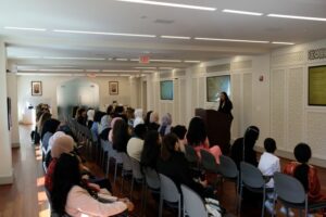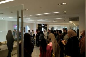 The group toured SQCC’s permanent exhibition where they learned about the aflaj irrigation system, Oman’s maritime history, and the role of frankincense in Omani hospitality. The group was presented with an introduction to Oman through a comprehensive PowerPoint on Oman’s culture, people & history. After the presentation, the group played a trivia and were asked about some information included in the presentation such as how many governorates are in Oman, what are the countries that have borders with Oman and the name of the frankincense burner? The winners received prizes, which included a small silvernecklace with a symbol from Oman such as the khanjar .