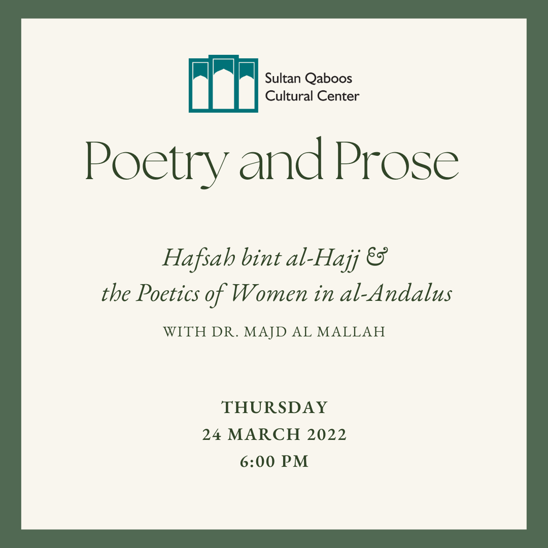 Sultan Qaboos Cultural Center 1100 16th St. NW., Washington, DCRSVP HERE: http://events.constantcontact.com/register/event?llr=jjfaurzab&oeidk=a07ej20vs265d16cf0e In this talk, Dr. Majd Al-Mallah will examine the poetry of the Andalusī woman poet Ḥafṣah bint al-Ḥājj (d. 589/1191) in the context of a rich body…