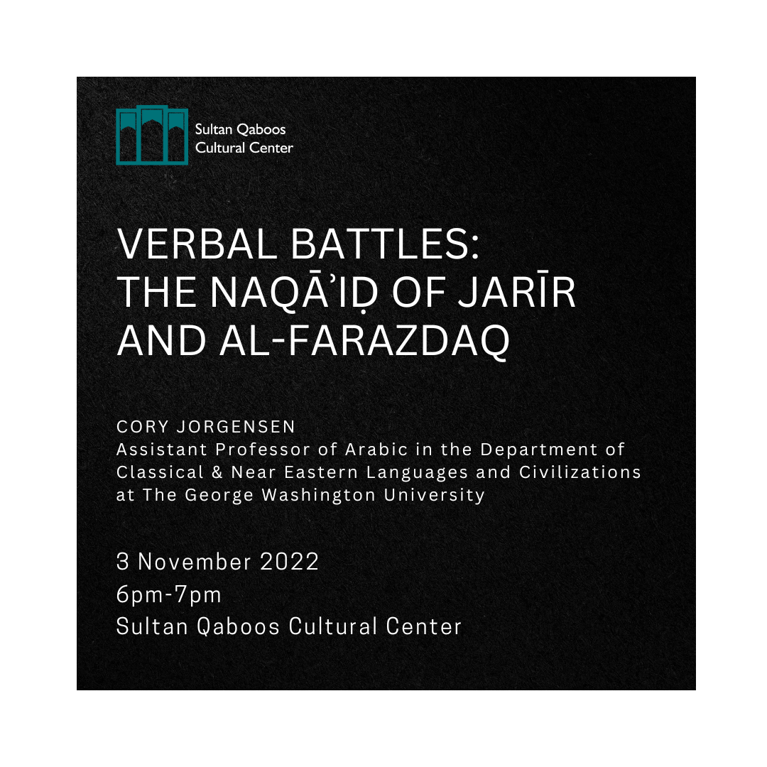 Sultan Qaboos Cultural Center 1100 16th St. NW., Washington, DCRSVP HERE: http://events.constantcontact.com/register/event?llr=jjfaurzab&oeidk=a07ejg67qb8a5cc2cd0 This presentation will focus on Cory Jorgensen's forthcoming monograph, Throwing Down the Verbal Gauntlet: The Arabic Invective of Jarīr and al-Farazdaq. The book studies the flytings poetry…